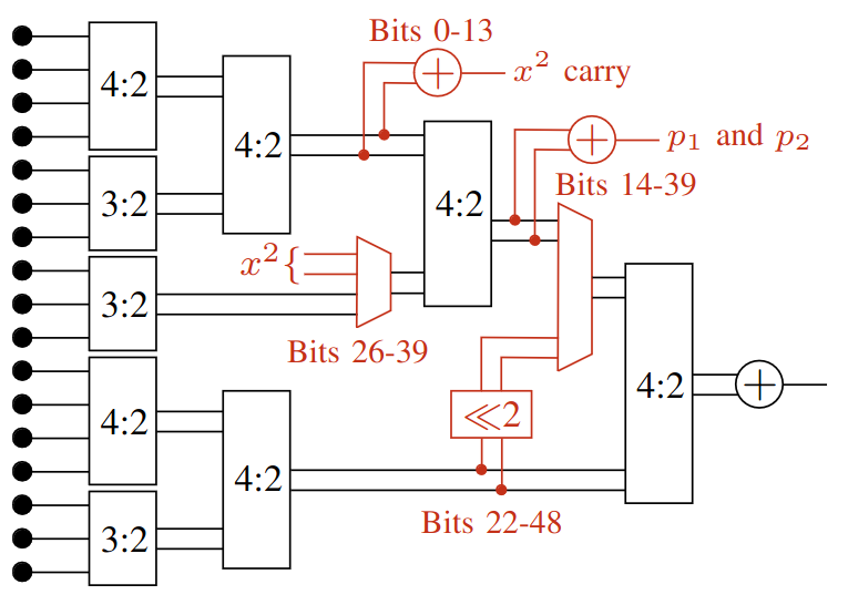 Unlike competing ASICs arriving at the time, we used a full-custom SHA-2 implementation based on a fully-unrolled pipeline with extra stages added to reduce the critical path by 50% compared to a naive implementation, significantly improving hash rate per mm2 and per watt.